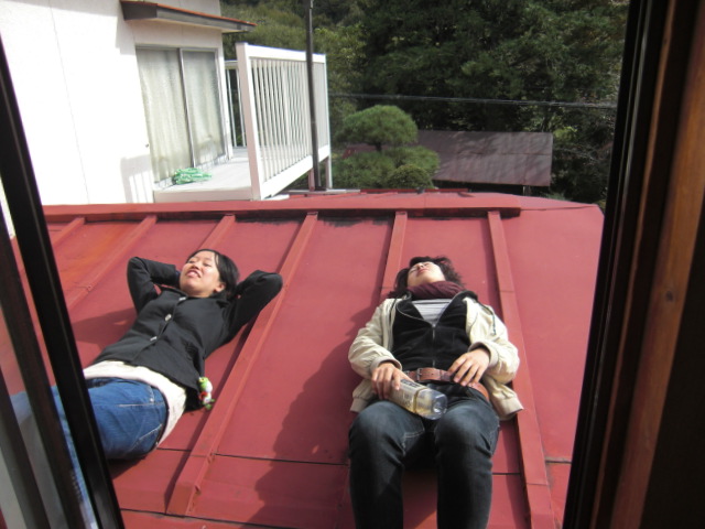 ゼミ合宿はこれにて終了。なぜか民宿の屋根の上でくつろいでいるゼミ生たち。