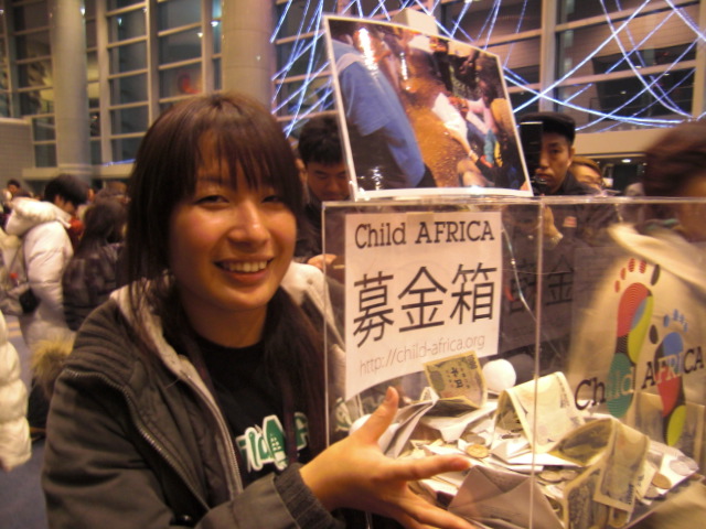 今、Child Africaをお手伝いしている元ゼミ生の粟村さんも頑張って募金を集め